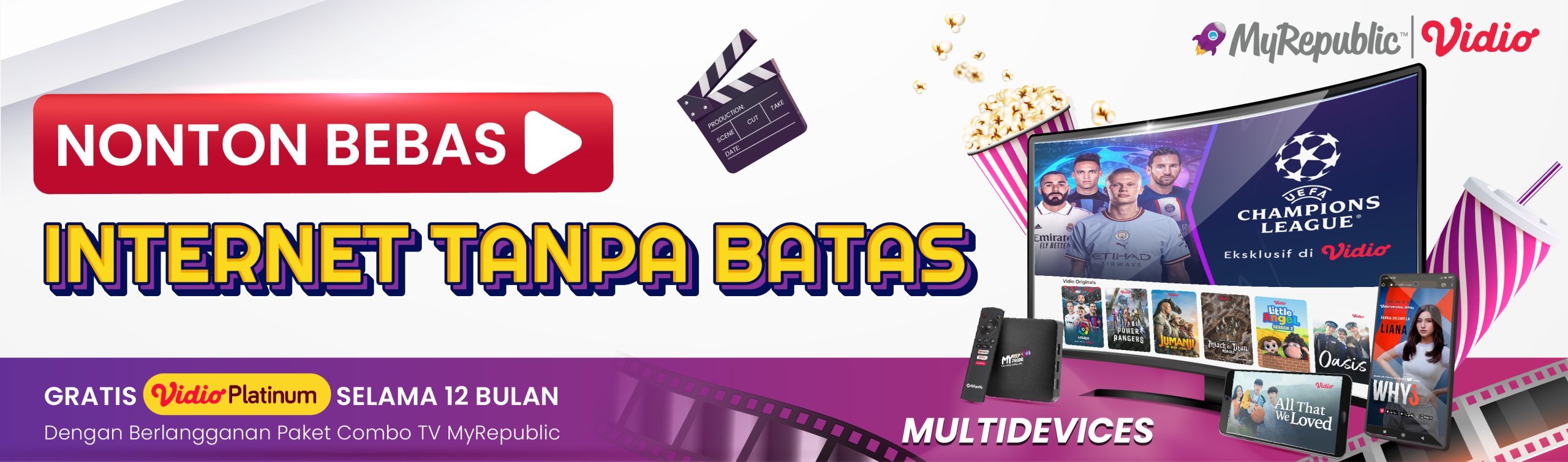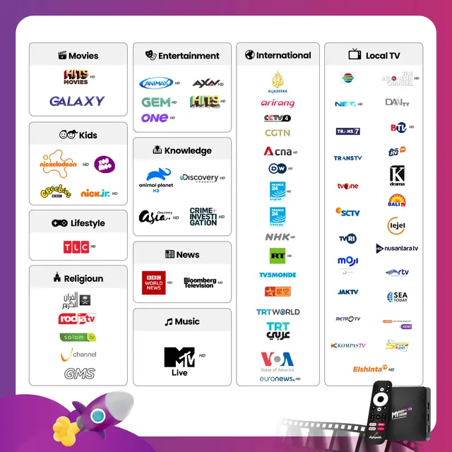 Menghadirkan lebih dari 50 channel dengan kualitas SD hingga HD yang akan memanjakan Anda dan keluarga. Dengan TV Kabel terbaik dari MyRepublic nikmati berbagai pilihan channel mulai Movies, Sport, Kids, News dan masih banyak lagi. Rasakan serunya menonton di TV Kabel MyRepublic.