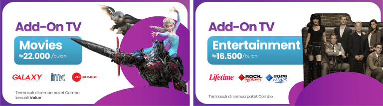 Tayangan berkelas dari channel dalam dan luar negeri seperti box office, drama, sports, kartun, edukasi sampai lifestyle siap menemani waktu santai Anda bersama keluarga. Lengkapi juga Paket TV Kabel terbaik Anda dengan paket Add On Channel yang sesuai kebutuhan Anda.